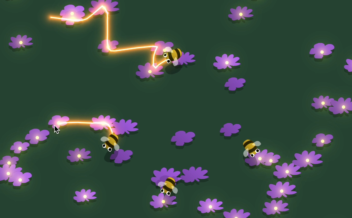 In this game, you optimize the paths your bees take in order to collect pollen as fast as possible. Compete on the global leaderboard and be the best you can be!